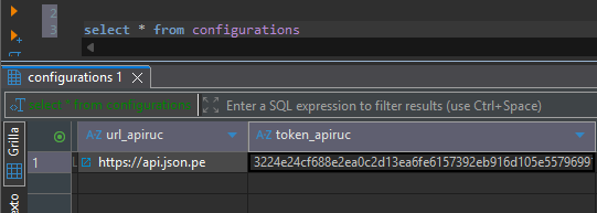 - Para realizar esta configuración, accede a tu base de datos y localiza la tabla configurations. Asegúrate de completar las columnas url_apiruc y token_apiruc con los valores proporcionados para la API